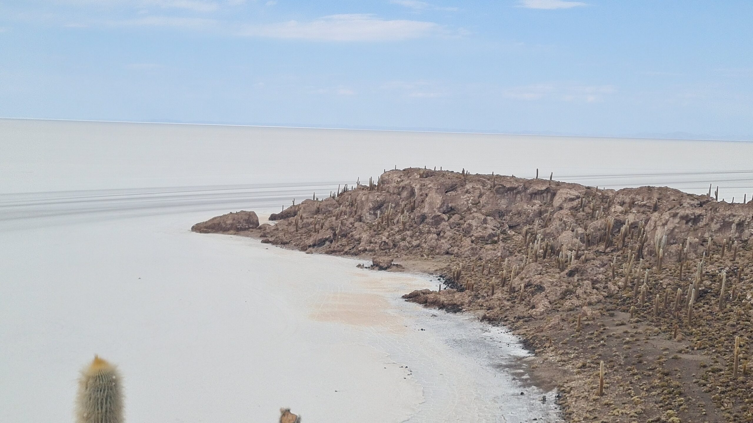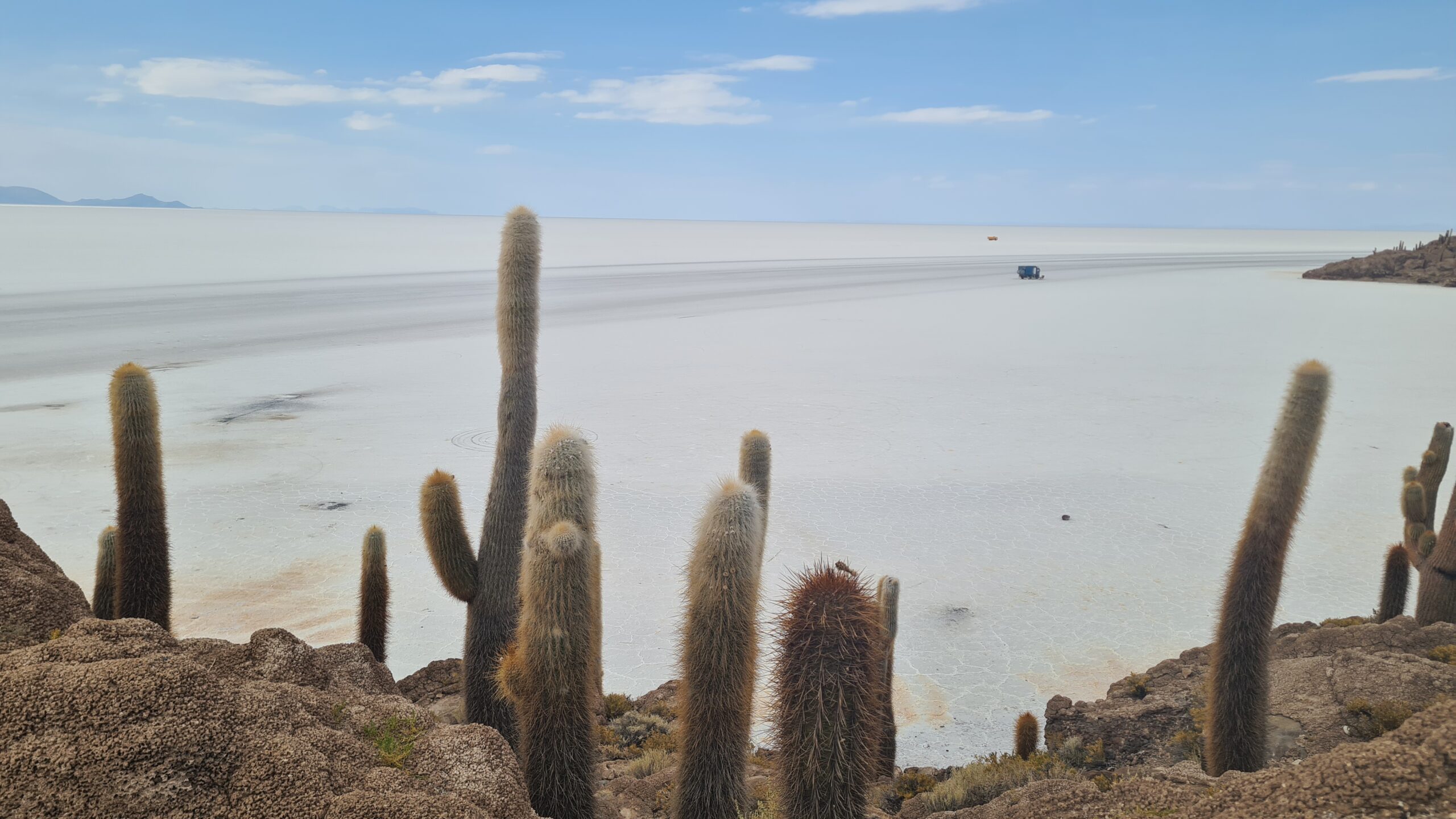 Isla Incahuasi: Eine Insel mitten im Nichts, bewachsen mit jahrhundertealten Kakteen. Von oben bietet sich ein 360°-Panorama über die weiße Weite. Die Insel war einst ein Korallenriff, als das Gebiet noch ein See war.